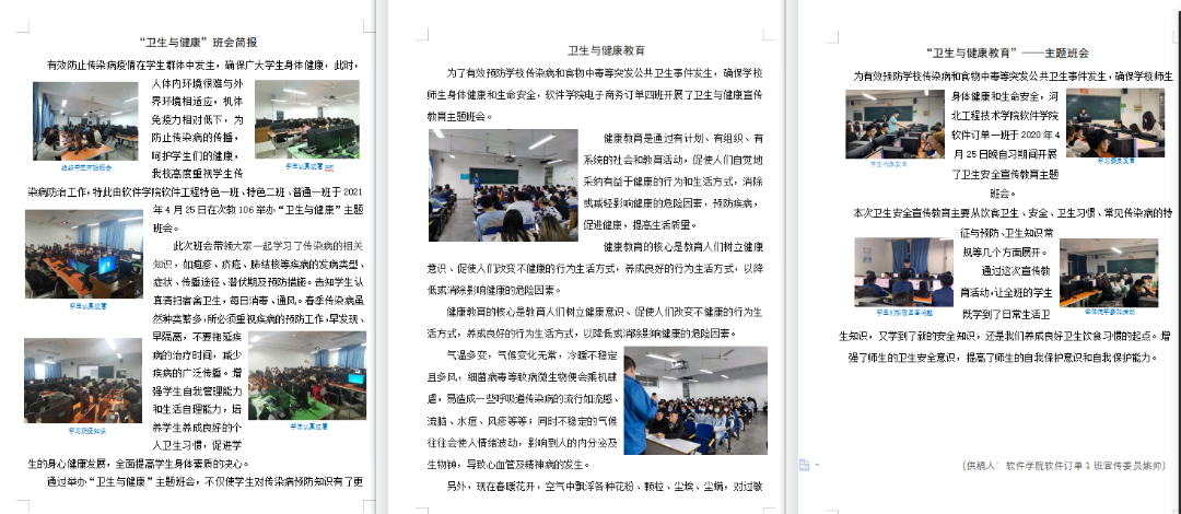 2、4月10日,开展“卫生与健康”主题班会活动,辅导员进班级通过PPT展示,案例讲解等方式,向学生介绍了春季传染病及流行病等传播途径、常见症状及预防方法。通过班会的开展进一步增强师生的健康与卫生意识,同时也了解到严格执行校园防控制度的必要性,有力推进了春季传染病预防工作的进行,为进一步做好常态化疫情防控工作奠定了基础。