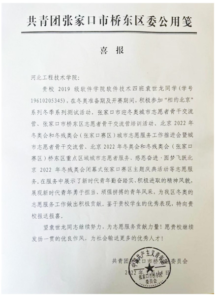 近日,共青团张家口市桥东区委员会向我院发来喜报:我院2019级软件技术四班袁世龙同学积极参加张家口市迎冬奥志愿者系列活动,表现优秀,特向我院报送报喜。