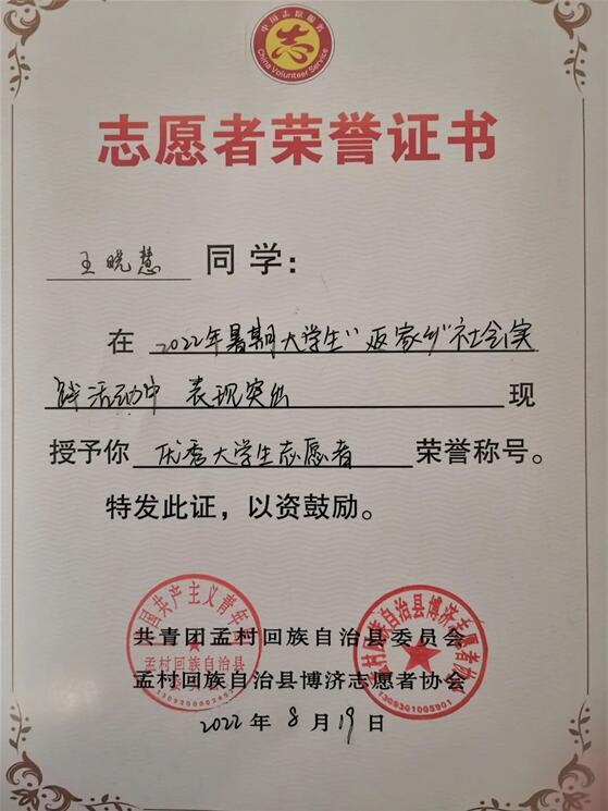 王晓慧同学说:“我们正值青年,能帮忙做一些力所能及的事情,我们义不容辞。我将继续投身于防疫宣传工作,保护家园,为家乡疫情防控工作奉献自己的一份青春力量。”