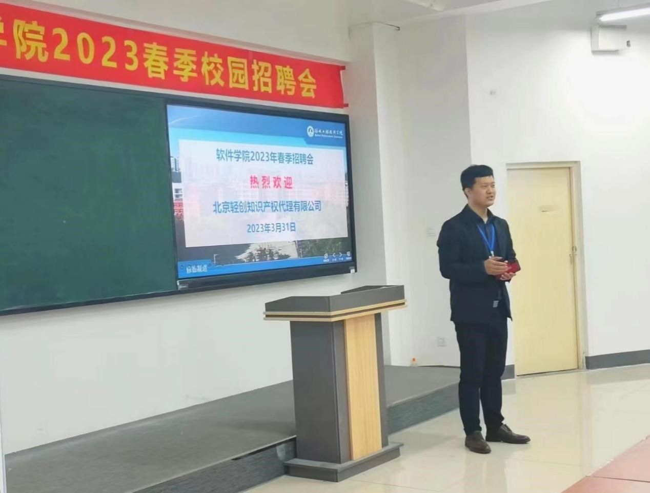 当下,正是用人单位招聘和大学生求职的旺季,为持续做好就业创业服务工作,促进高校毕业生顺利就业,2023年3月31日中午,软件学院在知行楼2-1教室举办2023春季校园招聘会,特意邀请北京轻创知识产权代理有限公司进行专场招聘宣讲。