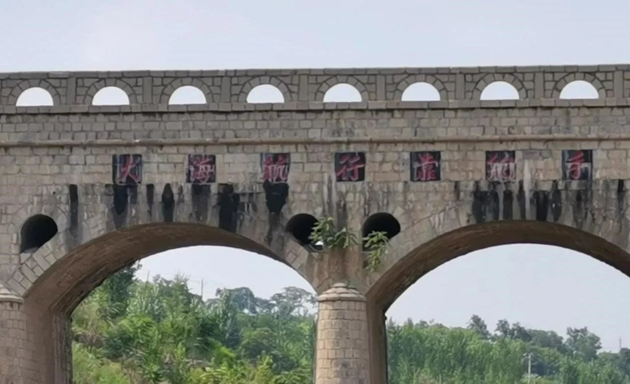 在都党渡槽的中间写有“大海航行靠舵手干革命靠毛泽东思想”字样。舵手是大海航行中不可或缺的重要角色,他们通过掌舵调整航向,确保船只安全航行。同样的,毛泽东思想在中国革命历程中扮演着重要的角色,指引着中国共产党领导人民进行顽强斗争,取得了中国革命的胜利。正如舵手对船只的导航,毛泽东思想对中国革命的指导起到了至关重要的作用。