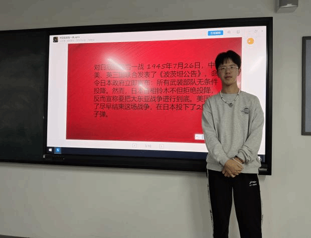 网络空间安全三班的常阔同学和软件工程二班的杨卓晔同学主要讲述了中国人民抗战胜利的重要意义。中国人民抗日战争,是近代以来中华民族第一次取得完全胜利的反侵略战争和民族解放战争,是20世纪中国和世界历史上的重大事件,也是战争史上的奇观。