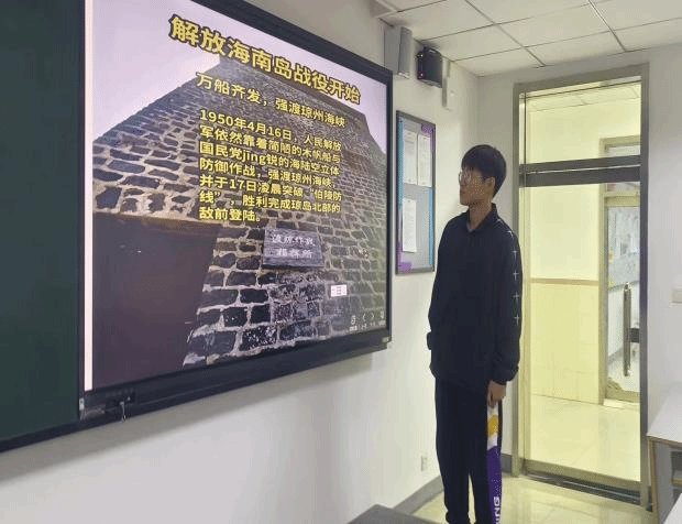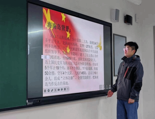 2022级网络空间安全一班的孙嘉慧同学和网络空间安全三班的李新学同学主要介绍了海南岛解放的过程。1949年10月,逃到海南岛的国民党海陆空军残部共约10万人,构筑工事,布设阵地,企图长期盘踞。人民解放军第四野战军的两个兵团,先于1950年3月5~31日,在琼崖纵队接应下,相继派遣两个团又三个营分批偷渡登陆,以加强岛上的接应力量。4月16日,解放军主力在无海空军配合的情况下,发起渡海登陆作战,冲破敌海陆军的重重拦阻,在琼崖纵队和先期登陆部队的接应下,胜利登陆,经连续作战,共歼敌三万余人,余敌由海上逃窜。至5月1日,全部解放海南岛。