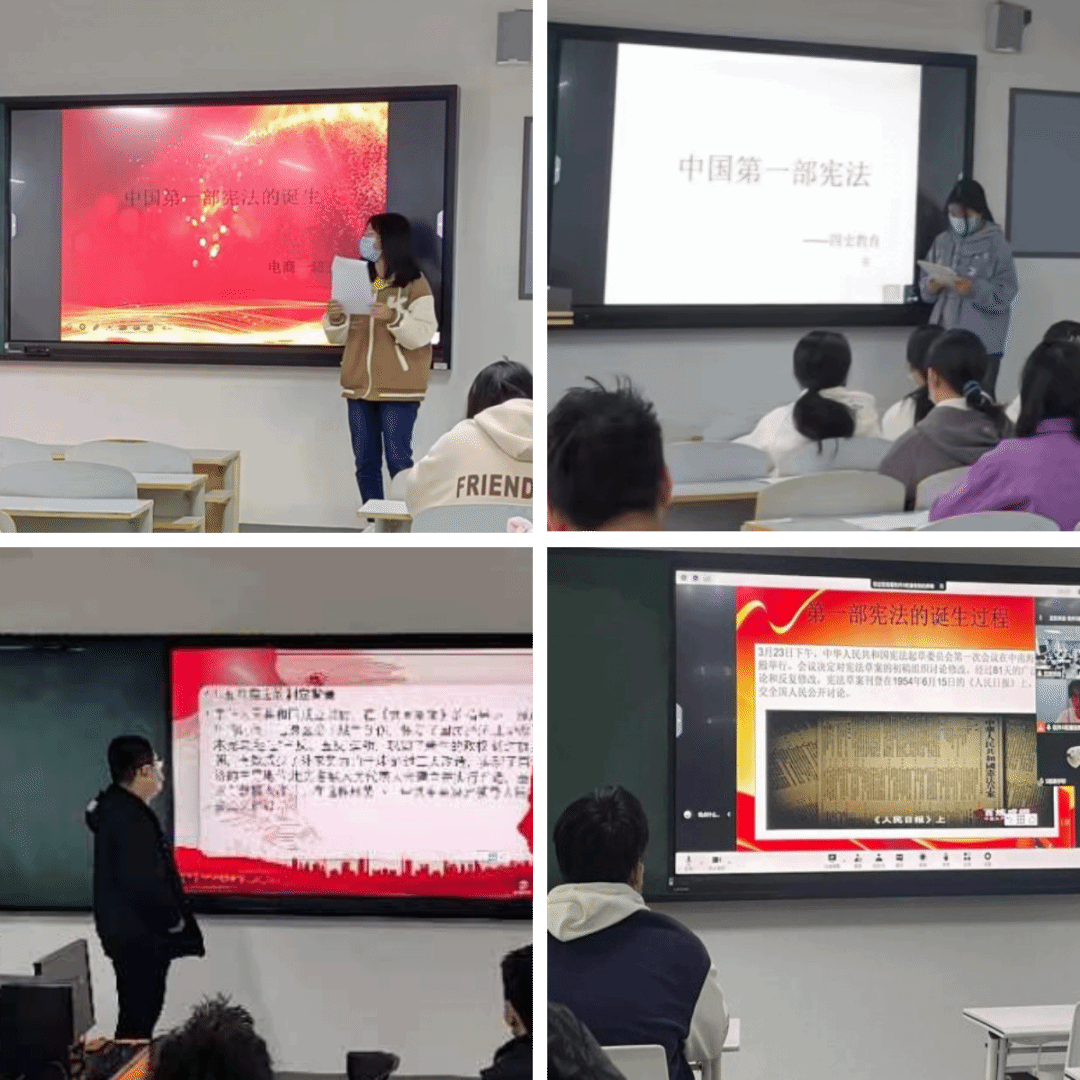 为丰富校园活动,引导学生成长,我院开展以新中国第一部宪法的诞生为主题的四史专题教育,在张跃也老师的指导下,电子商务1班、电子商务2班、软件工程4班、软件工程5班和软件工程6班的同学们积极踊跃地发表了激情四射的演讲。几位同学在演讲前做了充足准备,站在台上侃侃而谈,利用自己精心制作的ppt,为同学们深刻讲解新中国第一波宪法的诞生。