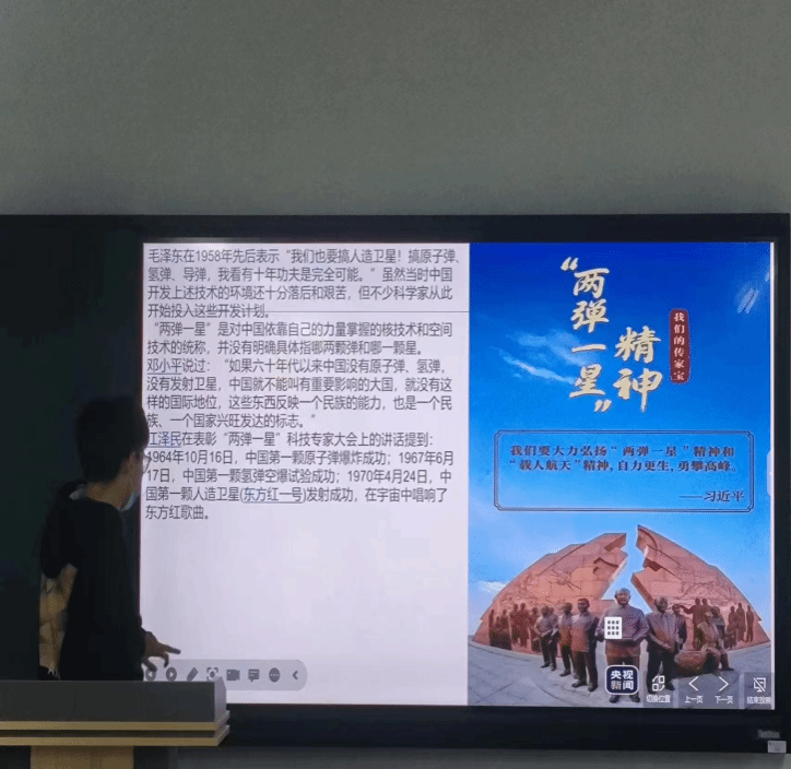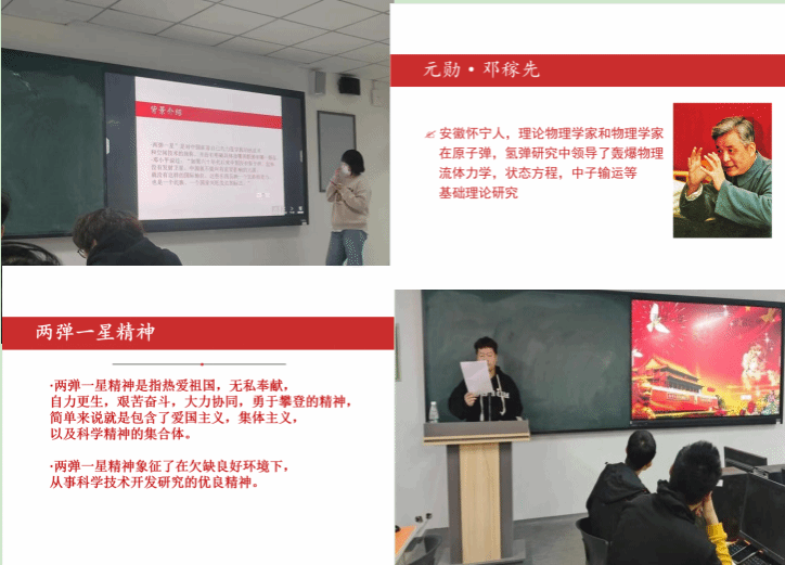 几位同学在演讲前做了充足准备,浏览和查阅相关资料,站在讲台上侃侃而谈,为同学们生动讲解两弹一星的故事。