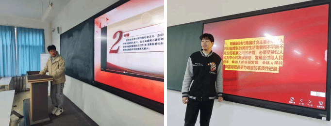 2022级软工4班的孙雨铭同学介绍了十个明确的主要内容。第一个明确揭示了党的领导与中国特色社会主义的内在关系,标志着我们党对马克思主义建党学说和社会主义发展规律的认识达到新的高度。第二个明确阐明了建设社会主义现代化强国的战略安排,阐明了要以中国式现代化推进中华民族伟大复兴的战略逻辑。第三个明确其强调的是新时代中国共产党人民至上的信念和价值取向,进一步丰富了解决当代中国发展主要问题的实践要求。第四个明确,表明了我们党对中国特色社会主义建设规律和人类社会发展规律的新认识。第五、六、七、八个明确这四个明确也是四个方面的目标要求,其中前三个目标要求是在制度层面,后一个是在实践层面。第九个明确指出了我国外交在国际大局中的方向和定位,在世界多极化、经济全球化、社会信息化、文化多样化深入发展的背景下,尤为体现新时代中国特色大国外交的全球视野、世界胸怀与历史使命。第十个明确与第一个明确首尾呼应、相得益彰,展现了习近平新时代中国特色社会主义思想这一理论体系的完备性和贯通性。