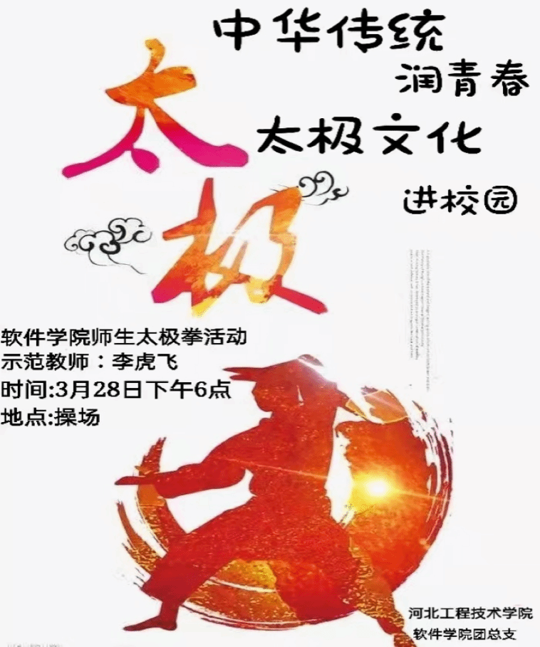 太极是中华传武术的精华,历史悠久,博大精深,是中华民族的瑰宝。为了增强师生身体素质,弘扬和传承中华传统文化,河北工程技术学院软件学院在操场举行“中华传统润青春,太极文化进校园”活动。