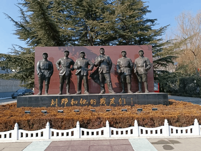 走进太行山革命老区涉县赤岸村八路军一二九师司令部旧址,首先映入眼帘的是这尊由北京李庆芳教授依据史料精心设计、雕塑而成的“刘邓和他的战友们”塑像。人物左起分别是:蔡树藩、徐向前、邓小平、刘伯承、李达、黄镇。群雕基座长8.1米、宽2.35米、高1.29米,铜体重达10余吨,基座题词由原南京军区司令员向守志将军所书。