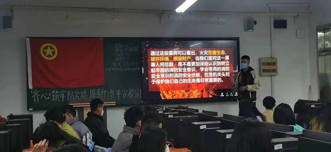 活动于晚上19点正式开始,由各班团支书给同学们讲解此次班会意义和目的,组织同学们观看消防安全直播视频,通过ppt向同学们展示有关火灾事故的新闻和照片,和同学们讲解了相关实例。让同学们通过对火灾事件的了解,知道发生火灾的主要原因,提高学生的防火意识,明确防火自救的重要性,让同学们掌握更多的消防安全常识及识别消防安全标示。