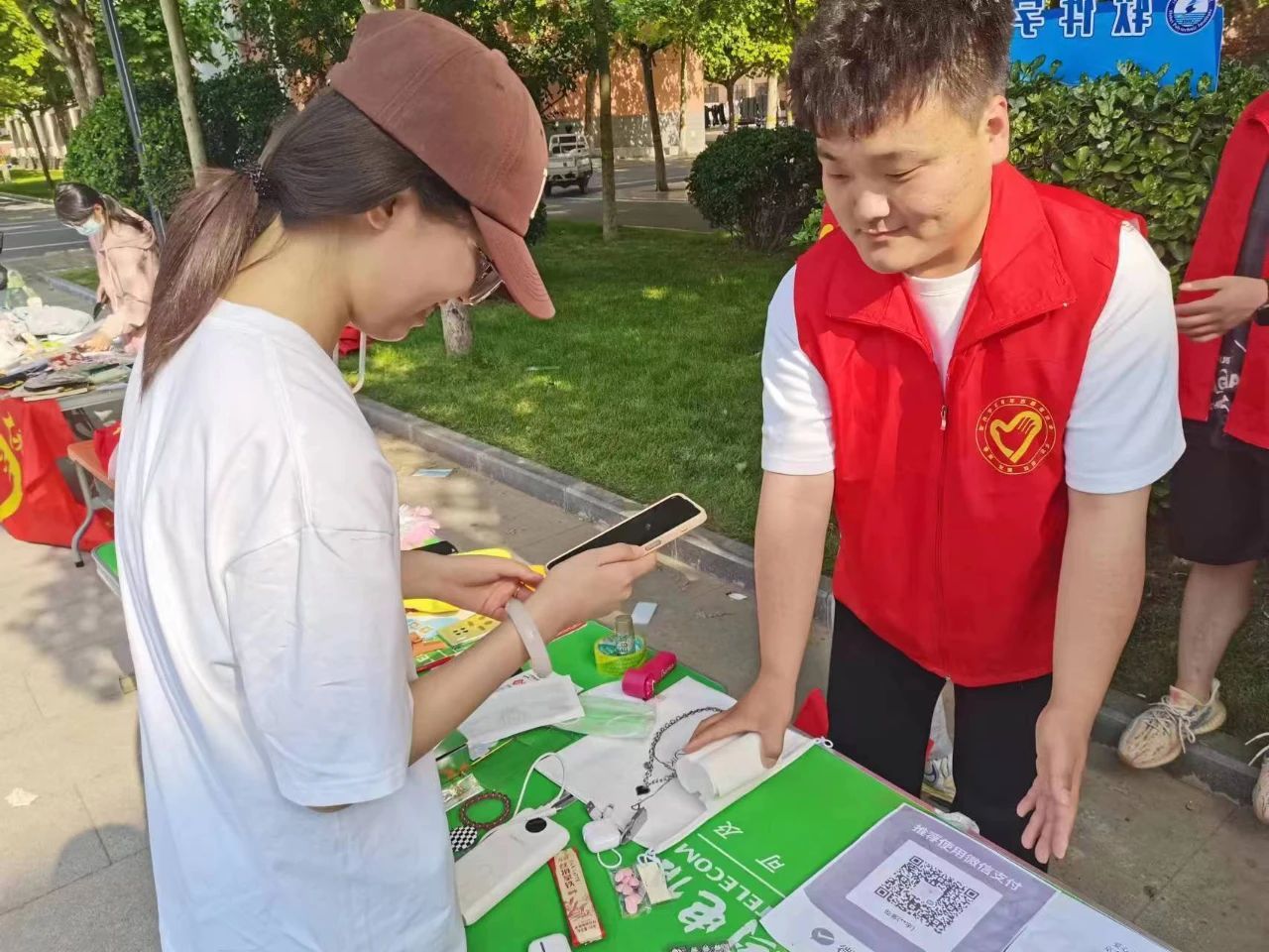 活动进行时,全校师生热情似火,奔走于各个摊位之间,欣赏、挑选、讨价还价,小小推销员、售货员的叫卖声、吆喝声此起彼伏,而想买东西的“小主顾”们,也在展台前流连忘返,选购着自己心仪的物品,以爱心交换爱心。整个活动现场暖意涌动,爱意浓浓,大家不仅买到了自己需要的物品,更为爱心工程贡献了微薄之力。