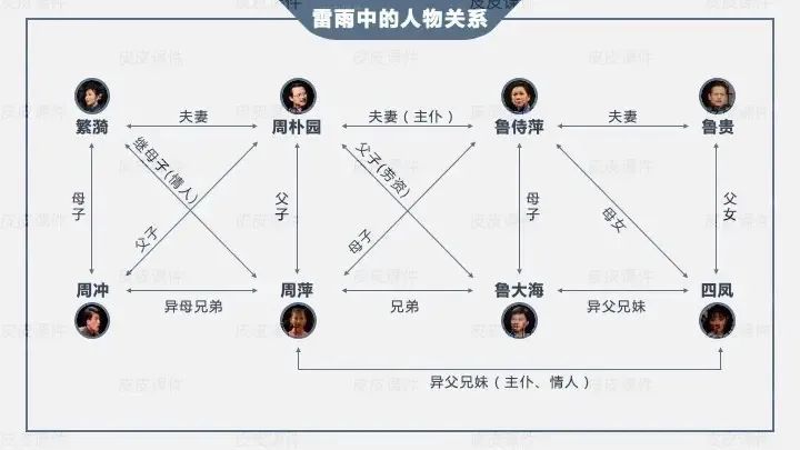 剧中以两个家庭、八个人物、三十年的恩怨为主线,伪善的资本家大家长周朴园,受新思想影响的单纯的少年周冲,被冷漠的家庭逼疯了和被爱情伤得体无完肤的女人蘩漪,对过去所作所为充满了罪恶感、企图逃离的周萍,还有意外归来的鲁侍萍,单纯着爱与被爱的鲁四凤,受压迫的工人鲁大海,贪得无厌的管家等,不论是家庭秘密还是身世秘密,所有的矛盾都在雷雨之夜爆发,在叙述家庭矛盾纠葛、怒斥封建家庭腐朽顽固的同时,反映了更为深层的社会及时代问题。