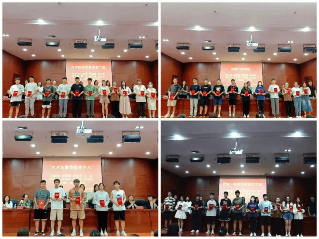 接着为获得2021-2022学年校级奖学金、校级三好学生、优秀学生干部、先进集体颁奖、优秀社团干部、优秀个人、优秀志愿者、优秀共青团员、优秀组织者、文体竞赛优秀个人等学生代表颁奖,以此鼓励同学们积极发挥自己的才智优势。是泥土,就烧成砖瓦;是铁矿,就百炼成钢;是金子,就放出光彩。