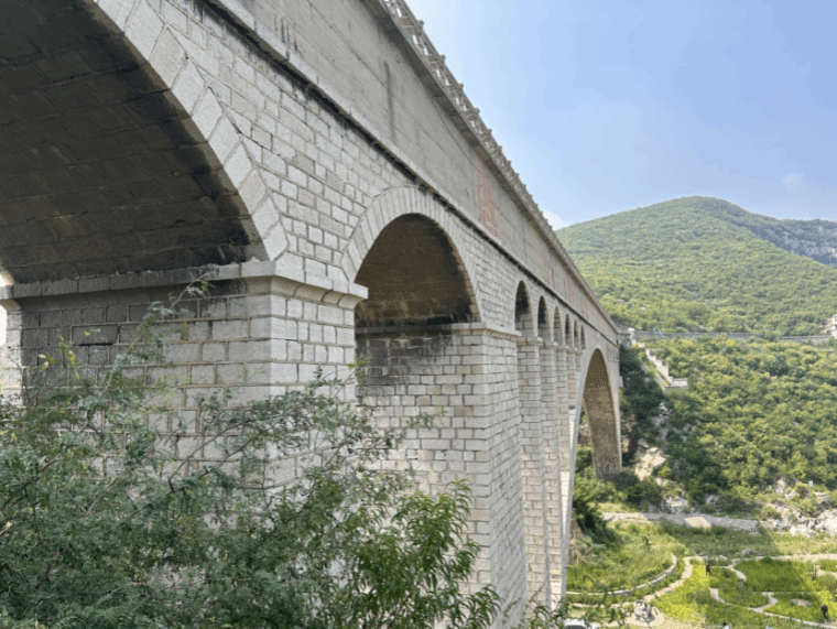 站在渡槽上眺望远方,跃峰渠如一条巨龙般盘旋在太行山脉的山腰。但这条巨龙并不是什么神灵的保佑,而是靠劳动人民的辛勤付出得到的。它遇山开路,遇谷搭槽,保证着人民的用水。
