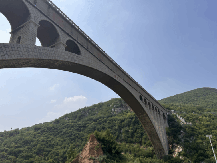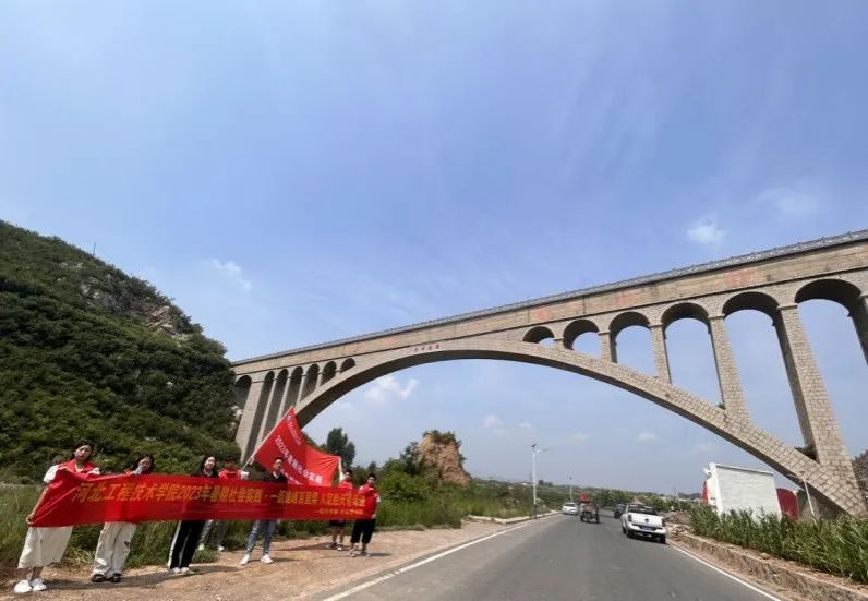 险峰渡槽位于磁县白土镇张二庄村东南,飞跨西部山区高家垴与跑马山之间,如一座峡谷飞虹,依然保持着“单拱跨度亚洲之最”的美誉。它是磁县跃峰渠水利工程中一个极其重要的工程,至今仍然发挥着重要的作用!2023年8月1日河北工程技术学院软件学院只此青绿队,在指导教师王峥、蒙翠平和韩红的带领下,第二站我们前往了险峰渡槽进行参观学习跃峰渠精神。