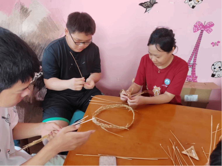 团队成员在自己家乡的兴趣班向中小学生宣传非遗文化,讲解了大名草编的历史、工艺特点及编织技巧,大家通过学到的技法最终编织出了有模有样的花纹。同时团队成员走进家乡村民的家里,向一些对非物质文化遗产感兴趣的中小学生分享了自己在事实践中的所见所闻,用通俗易懂的话回答了大家对非遗的一些疑问,“非物质文化遗产包括大家长时间以来口头传授,民俗的一些活动和礼仪,还有像一些节日,传统手工艺等等,而草编就属于传统手工艺。”团队成员这样介绍道。通过这次宣讲,可以看出来大家其实很愿意了解学习草编,他们在这之中学到了简单的草编编织技法,对非遗文化有了详细的了解。团队成员鼓励他们到学校以后可以讲给自己的同学们,做传播非遗文化的践行者。