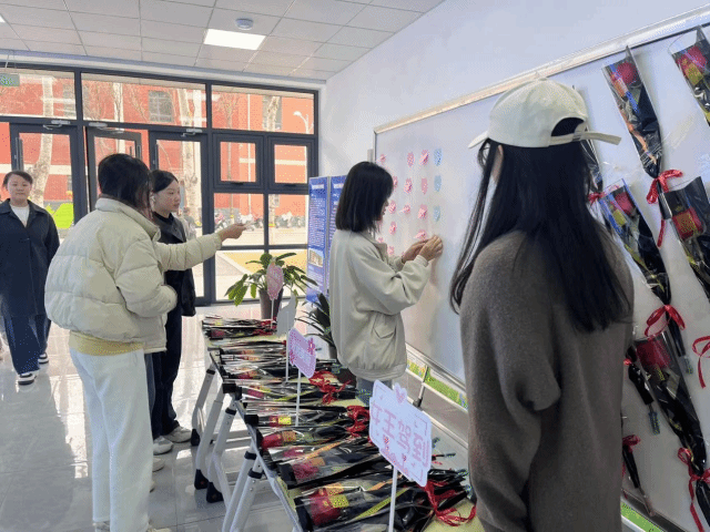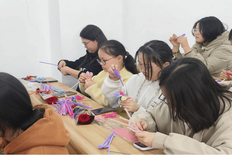 现场气氛热闹非凡。精致的玫瑰鲜花摆放在大厅,同学们可以在便签纸上写下自己想说的话,并可领取一枝鲜花并制作扭扭棒。五彩斑斓的扭扭棒整齐摆放,工作人员热情迎接每一位参与者,并展示精美的成品,激发大家的创作热情。
