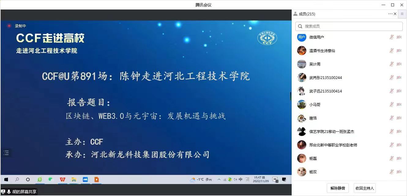CCF是中国计算机学会的简称,是致力于为计算机领域专业人士的职业发展提供服务的组织。此次的新龙大讲堂,河北新龙科技集团有幸请到了北京大学计算机学院陈钟教授为我院师生分享了“区块链、WEB3.0与元宇宙:发展机遇与挑战”的讲座,这也是“CCF走进高校”系列演讲公益活动的第891场。