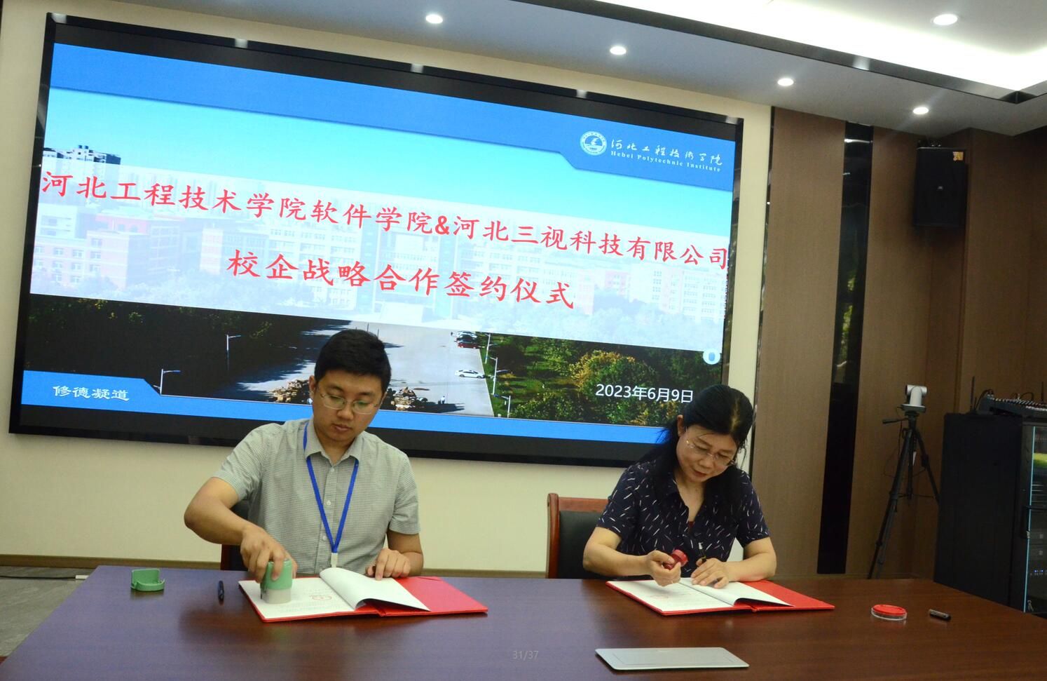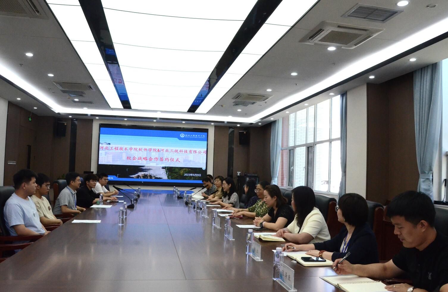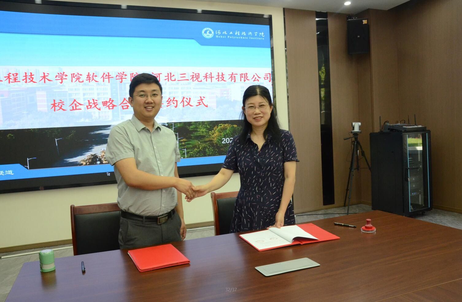 将项目引入校,为学生提供更多的实践机会一直是我院坚持的工作思路。我院一直将为学生积累实习、工作岗位和寻找合适的入校项目作为企业走访的目的。河北三视科技有限公司就是我院就业老师挖掘到的一家具有合作意向的企业。6月9日上午,三视科技总经理薛总带领公司技术骨干到校与我院签订合作协议。