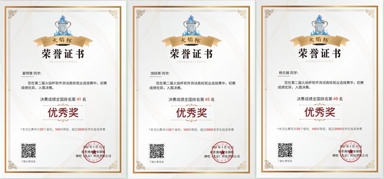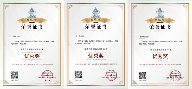 2022年4月,我院软件工程专业老师组织学生参加了第二届火焰杯高校就业选拔赛,我院学生与广西大学、重庆邮电大学、华东师范大学、华东交通大学、西安邮电大学、石家庄铁道大学、河北工程大学、内蒙古师范大学等知名院校的研究生、本科生同台竞技,取得了不菲的成绩。