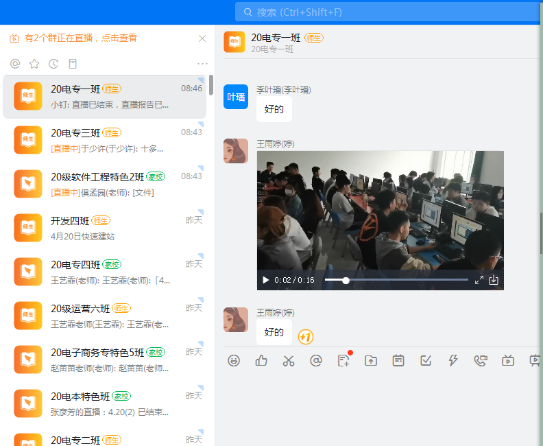 除了学校导员每天到教室巡班外,职业引导师也都会在课前10分钟组织有课的班级进行线上视频签到,线下由班委组织学生准时进入教室听课,目的是确保每位同学都能在课前10分钟进入教室以及学习状态。此外在线上课堂中职业引导师会随时加入课堂查看上课情况,课程结束会随机展开课后签到督促每位同学都做到不迟到、不早退养成良好的学习习惯,端正学习态度。